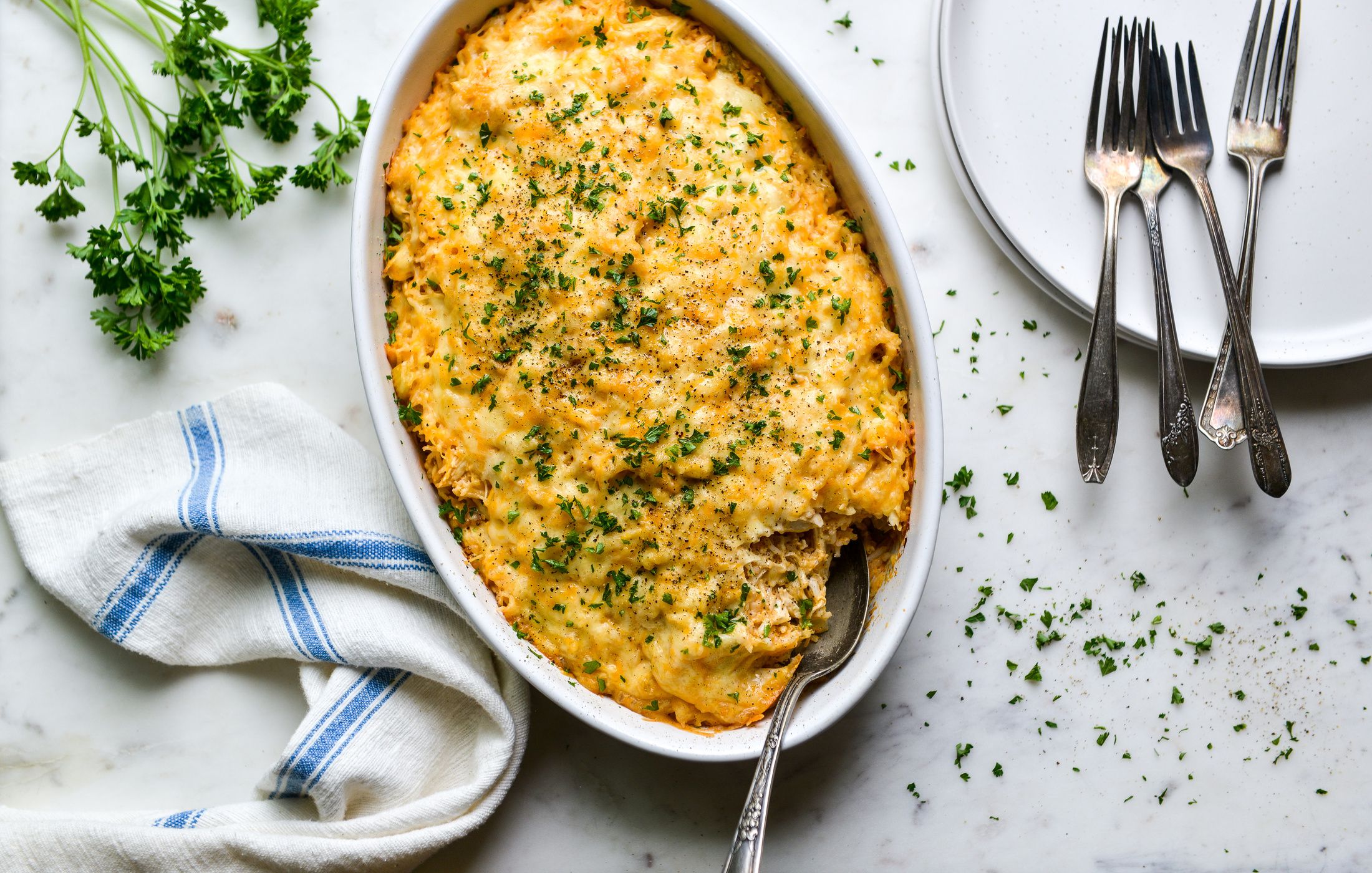 This high-protein casserole comes together very quickly and is a great way to use up leftover cooked chicken and rice! I would suggest roasting two chickens for dinner one night, and saving the meat from one of them. You can use the cooked chicken for quick lettuce wraps, as well as for this casserole on another night. Serve casserole with steamed green beans and a simple dinner salad for a balanced meal.