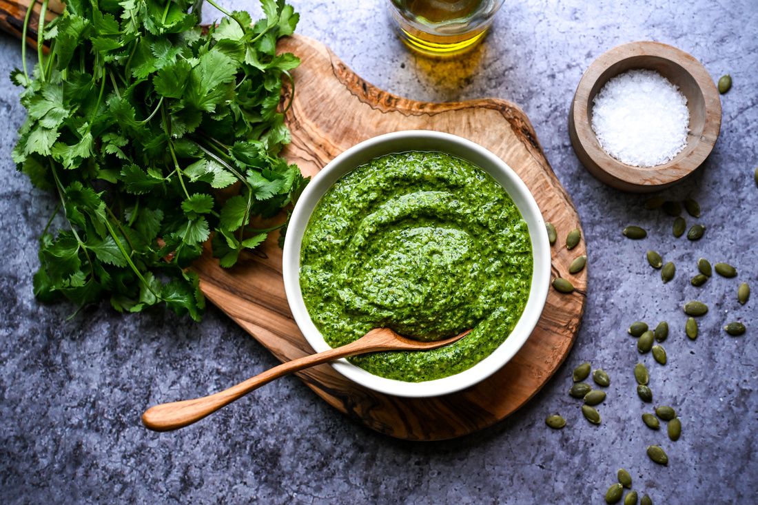 This vibrant cilantro pesto is fresh, zesty, and full of flavor with a slight kick of heat and a bright hint of lime. Made with pumpkin seeds instead of nuts and completely dairy-free, it has a rich, satisfying texture that pairs beautifully with a wide range of dishes. Spoon it over steaks, grilled chicken, or baked fish, drizzle it onto roasted vegetables, or toss it into sliced cabbage or zucchini noodles for a quick, flavorful side.