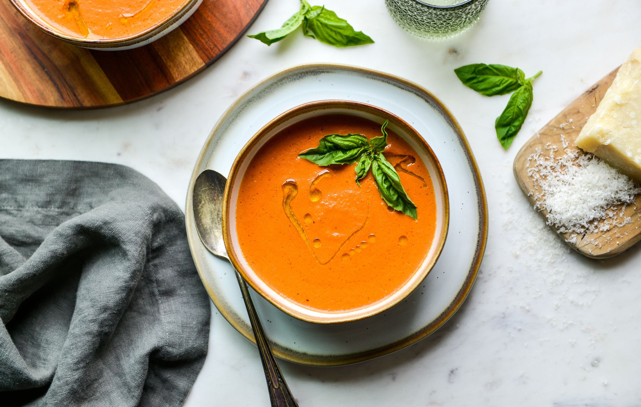 This classic creamy tomato-basil soup is so quick and easy to make! I use Jovial brand jarred diced tomatoes. Serve each bowl of soup with a drizzle of extra virgin olive oil, freshly grated parmesan cheese, extra basil, and freshly ground black pepper.