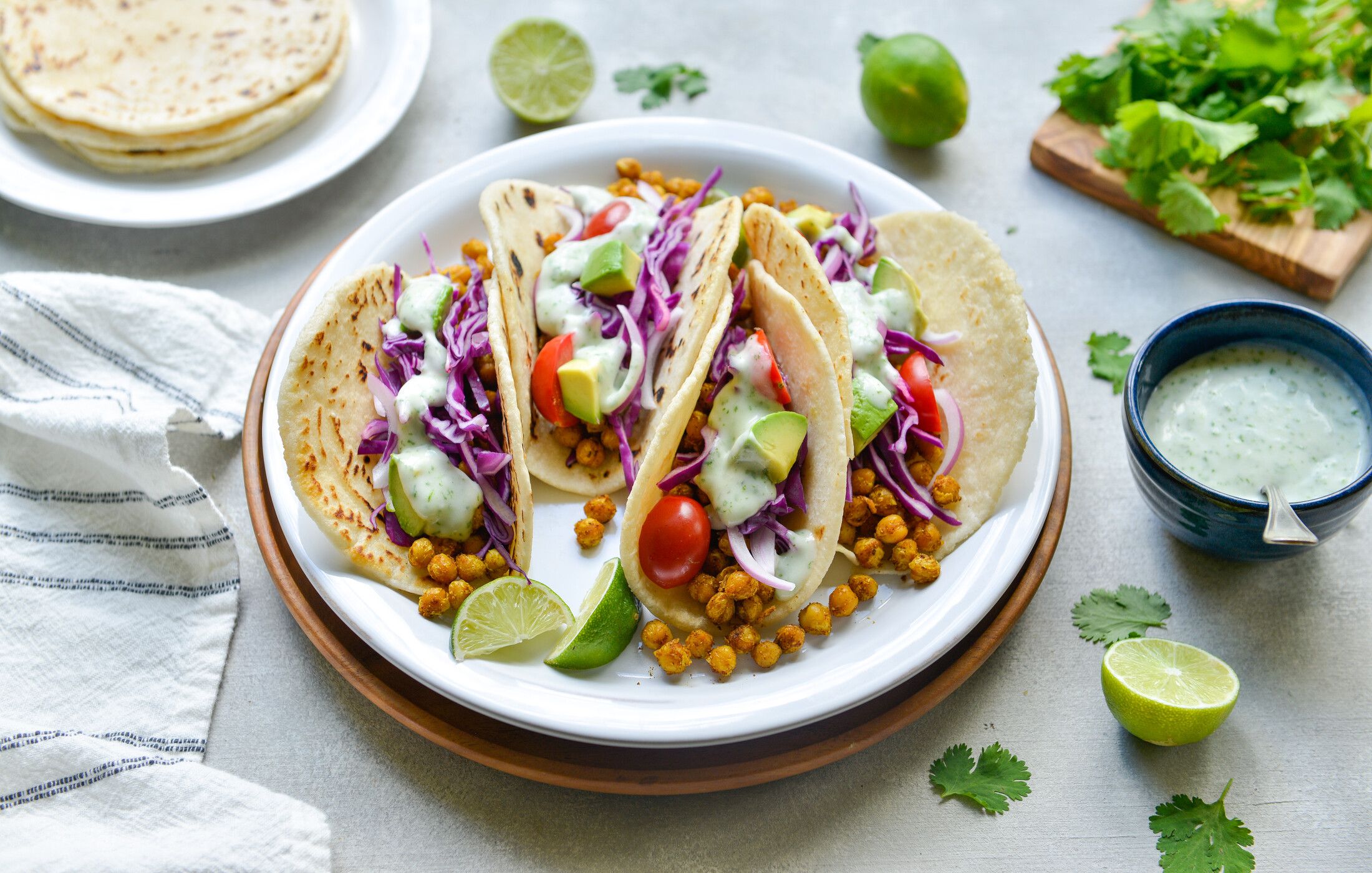 These plant-based antioxidant-rich tacos are always a crowd-pleaser! My children devour them. The pan-fried curried chickpeas are addicting! Use your favorite homemade or store-bought tortillas. Pictured here are my homemade grain-free Almond Flour Tortillas. If you are following a nut-free or elimination diet then use these Gluten-Free Brown Rice Flour Tortillas.
