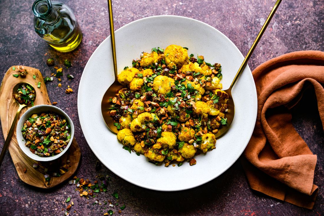 This warmly spiced roasted cauliflower brings a beautiful mix of fall comfort and bright, lively flavor. The curry spices deepen as the cauliflower caramelizes in the oven, while a fresh chutney-inspired crumble adds just the right touch of sweetness, crunch, and lift. It’s simple enough for weeknights yet special enough for a holiday table—an easy way to bring color, warmth, and nourishment to any autumn meal.