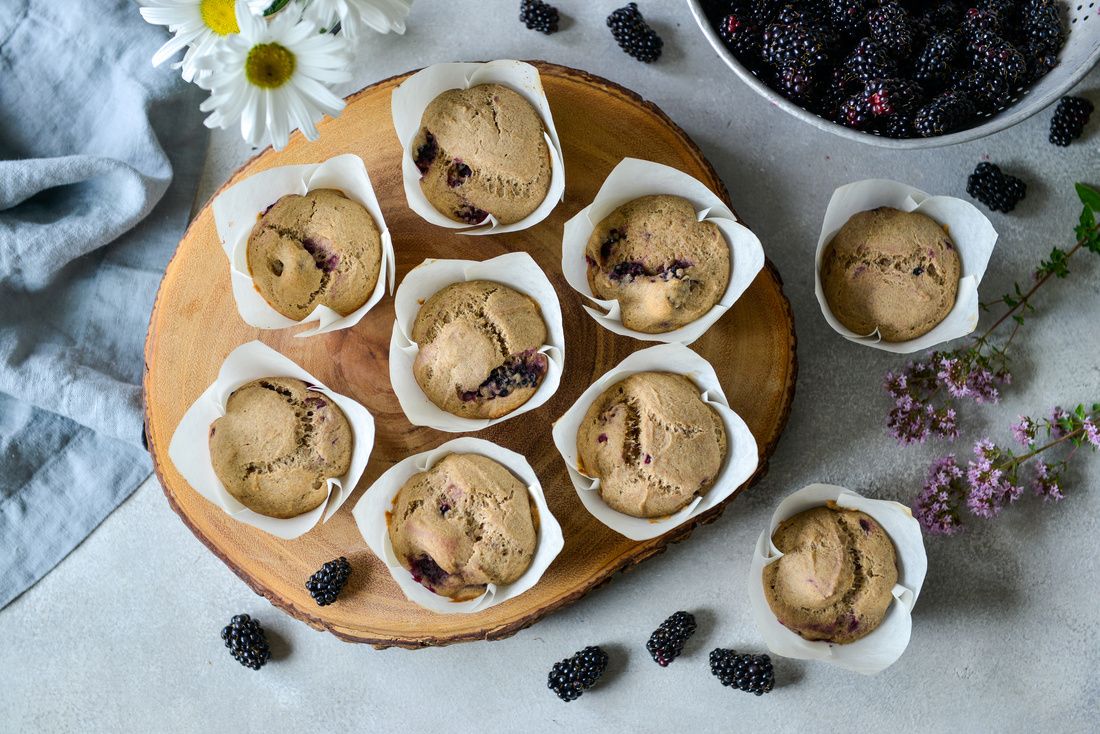 I have a large patch of vining blackberries and marionberries that grow up my fence and onto the support wires above. Each year they produce an abundance of beautiful berries that I need to freeze or use as they ripen on the vines. Grazing on these antioxidant-rich berries all day during the hot summer feels wonderful too. Some days I'll only eat the raspberries, blackberries, marionberries, and cherries growing on my property until dinnertime! These muffins are a great way to use some of the blackberry harvest, but you can use any type of berry in this recipe in place of the blackberries if needed!