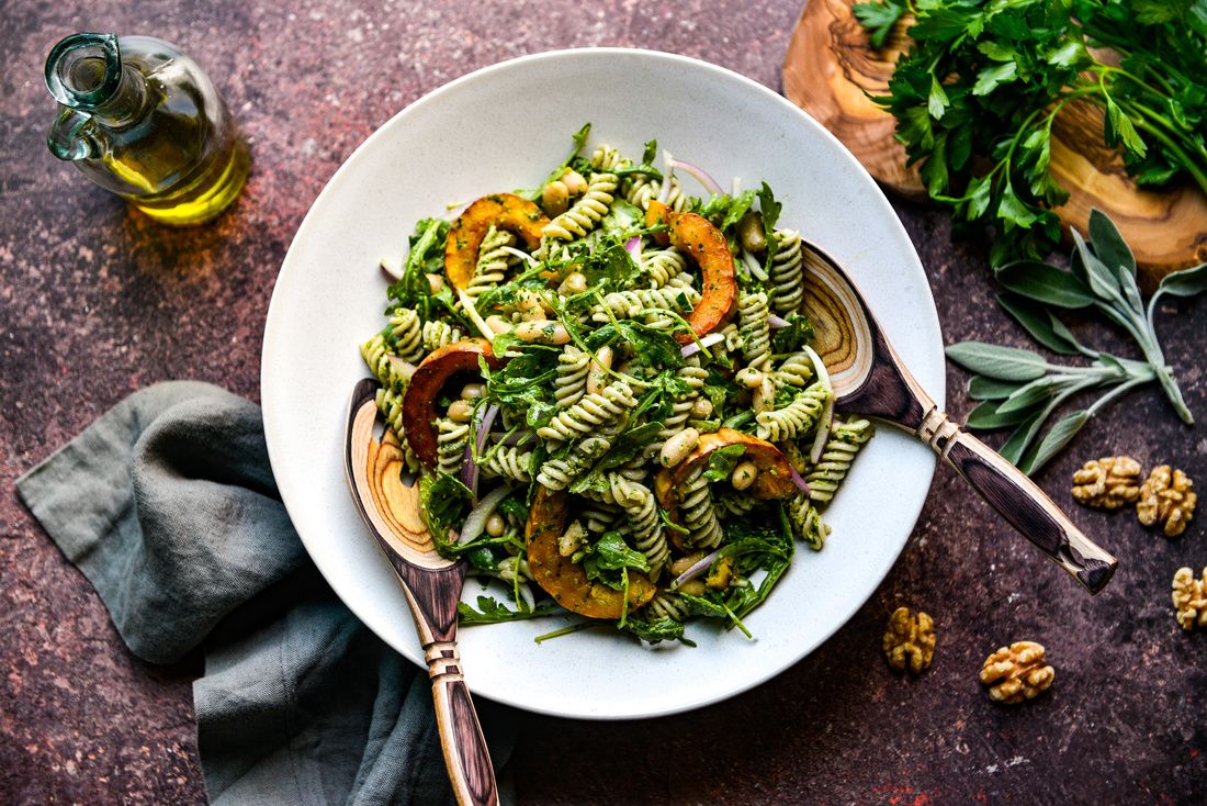 This autumn pasta salad brings together roasted delicata squash, creamy white beans, and peppery arugula—all tossed with a cozy sage–walnut pesto that captures the essence of fall. The flavors are mildly sweet, herbaceous, and grounding. Serve it slightly warm or at room temperature for an easy seasonal meal or a beautiful addition to a holiday table. It keeps well for a few days, making it perfect for meal prep or next-day lunches.