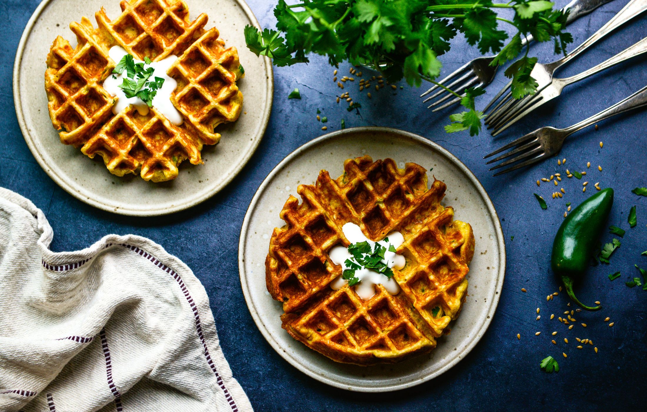 These savory, high-protein, gluten-free waffles are made with cottage cheese, eggs, and grated cheddar cheese! Finely diced jalapeño peppers give them a bit of a kick. Each waffle contains 33 grams of protein, 27 grams of fat, and 32 grams of complex carbohydrates—a perfect balance of macros for sustained energy!