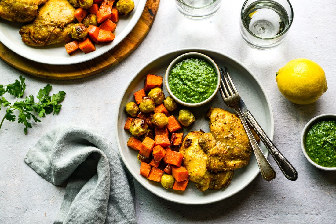 This simple sheet pan chicken and vegetable recipe is a nutrient-dense meal that works beautifully as a quick and easy dinner. Roasted chicken, brussels sprouts, and sweet potatoes come together with minimal effort. Serve leftovers the next day over fresh arugula with the garlicky green sauce for a fast, nourishing lunch. Sweet potatoes and brussels sprouts can also be replaced with a medium head of cauliflower and a chopped red onion for a simple variation. From an anti-inflammatory perspective, brussels sprouts provide polyphenols and sulfur-containing phytonutrients that support detoxification and immune balance, while sweet potatoes contribute carotenoids and polyphenols that help reduce oxidative stress and support metabolic health. The garlicky green sauce—made with fresh herbs, lemon, and olive oil—adds flavonoids and stable fats that help neutralize oxidative stress and support cellular resilience.