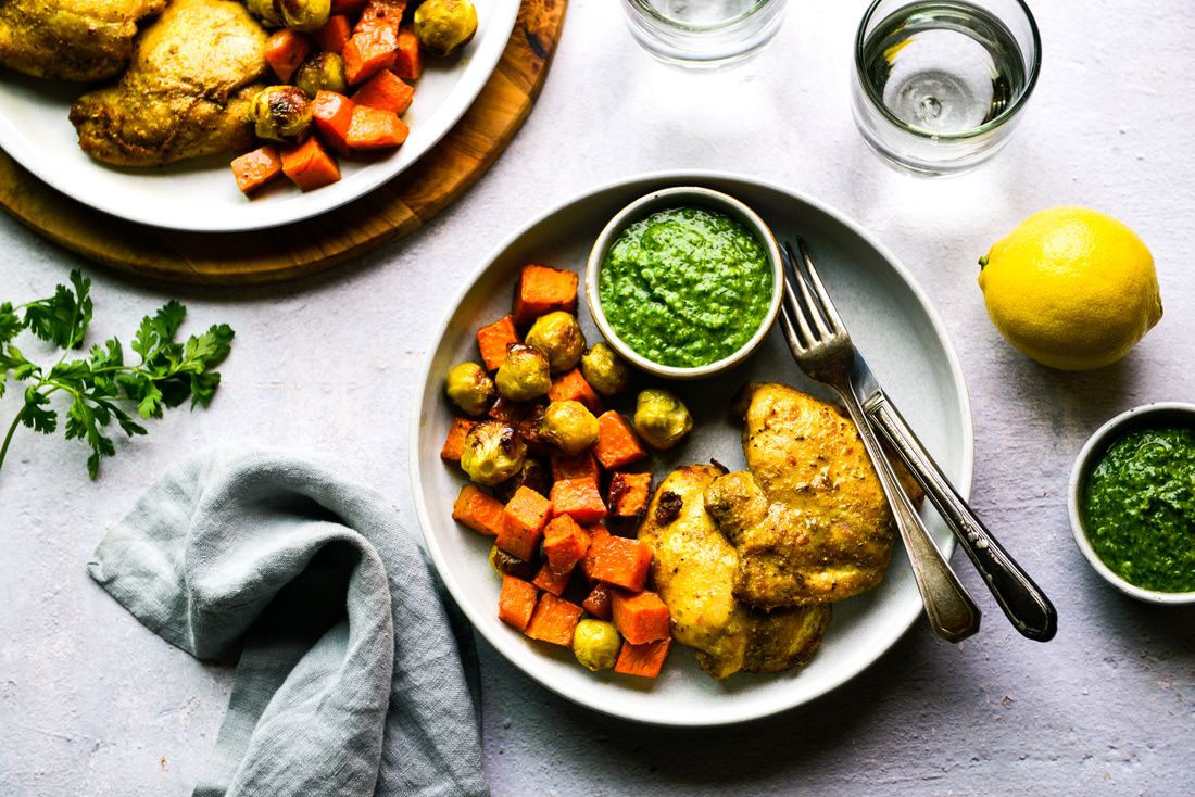 This simple sheet pan chicken and vegetable recipe is a nutrient-dense meal that works beautifully as a quick and easy dinner. Serve leftovers the next day over fresh arugula with the garlicky green sauce for a fast, nourishing lunch. The sweet potatoes and brussels sprouts can also be replaced with a medium head of cauliflower and a chopped red onion for a simple variation. From an anti-inflammatory perspective, brussels sprouts provide polyphenols and sulfur-containing phytonutrients that support detoxification and immune balance, while sweet potatoes contribute carotenoids and polyphenols that help reduce oxidative stress and support metabolic health. The garlicky green sauce—made with fresh herbs, lemon, and olive oil—adds flavonoids and stable fats that help neutralize oxidative stress and support cellular resilience.