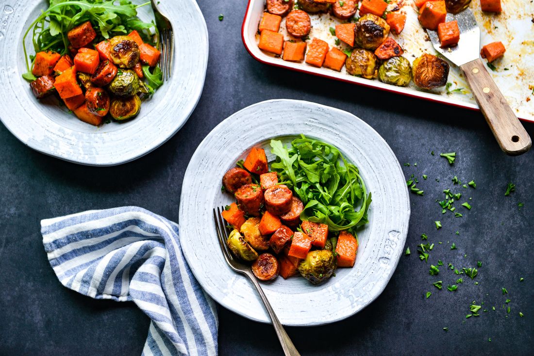 Sheet Pan Roasted Sausages, Sweet Potatoes, and Brussels Sprouts