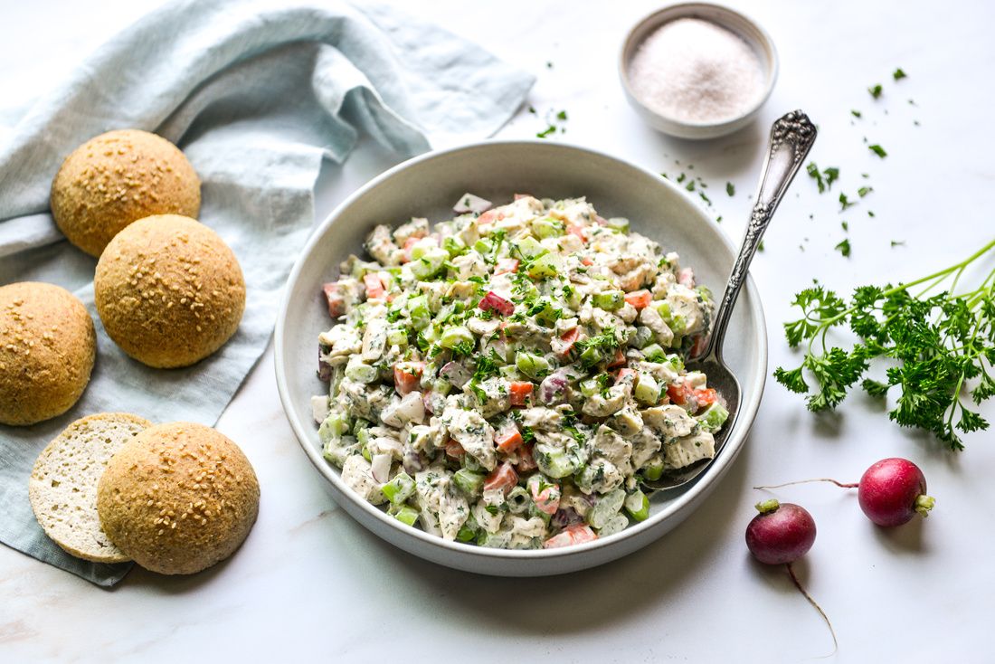 This veggie-loaded chicken salad is a refreshing, protein-rich meal that supports steady energy and inflammation balance. High-quality chicken provides complete protein for muscle repair and immune resilience, while crisp vegetables add fiber and phytonutrients. Radishes contribute cruciferous compounds that support detox pathways, while celery and parsley supply flavonoids such as apigenin and luteolin, known for their antioxidant and anti-inflammatory effects. Made with a clean avocado-oil–based mayonnaise, this salad delivers nourishing monounsaturated fats without the highly refined seed oils found in conventional mayo.